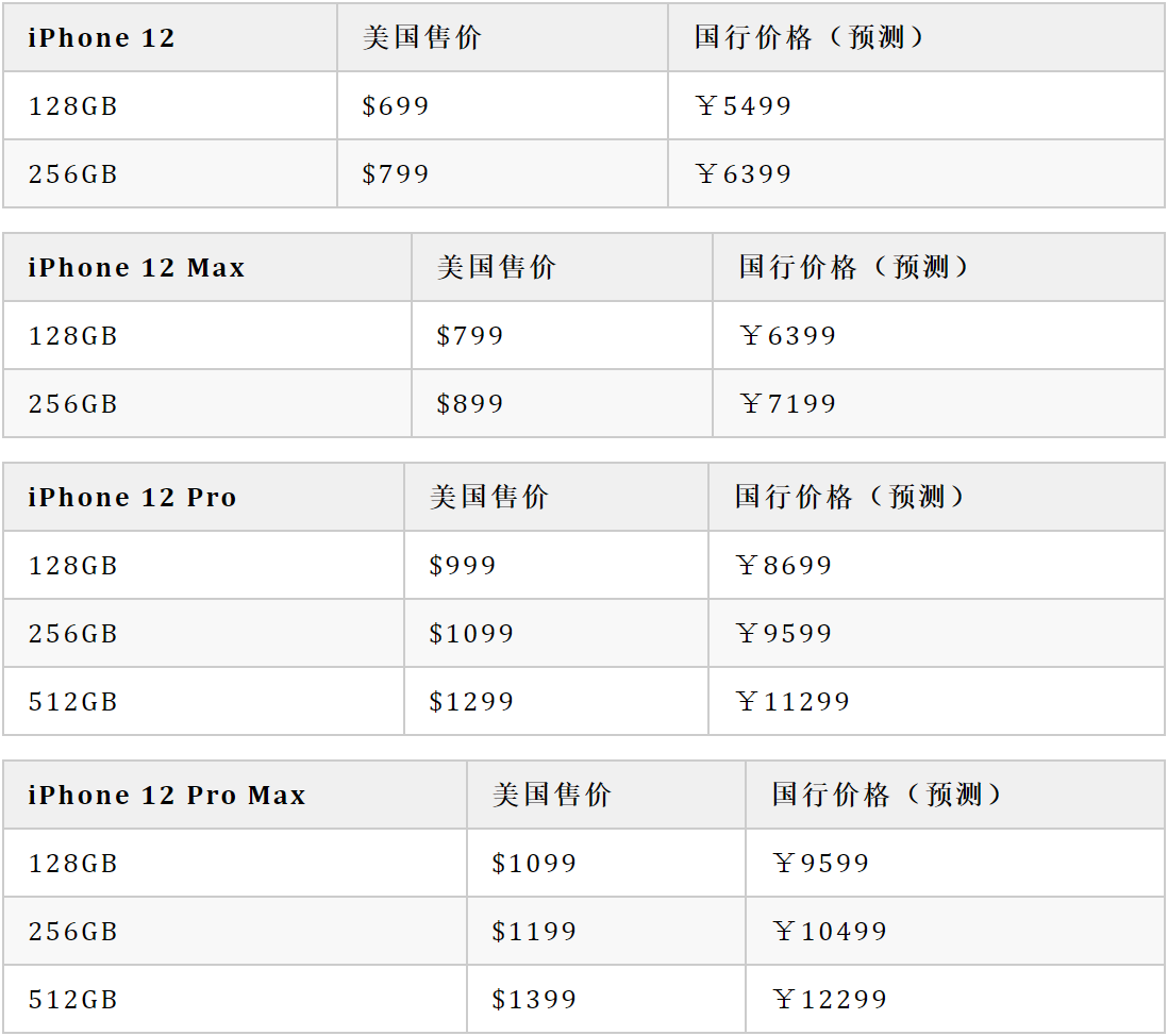市场价层面,最划算的 5.4 寸的 iPhone 12 128GB 价钱为 699 美金,预估中国价钱会是 5499 元。6.1 英尺显示屏的 12 Max 贵 100 美金,中国价钱将是 6 1000元之上。
