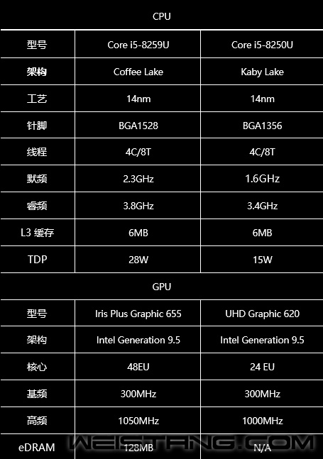 处理器以及核显对比Win本同级的i5-8250U来说性能优势非常明显,Iris Plus Graphic 655拥有独立的128MB eDRAM缓存,浮点性能超出UHD620二倍多。处理器除了架构上更新以外,基频比i5-8250U高了43%,睿频也更高,当然TDP也更高,达到了28W,实际上增强改进内部散热结构的18款MBP13应付i5-8259U完全没有问题,毕竟上面还有选配的i7-8559U,所以日常情况散热会更游刃有余。